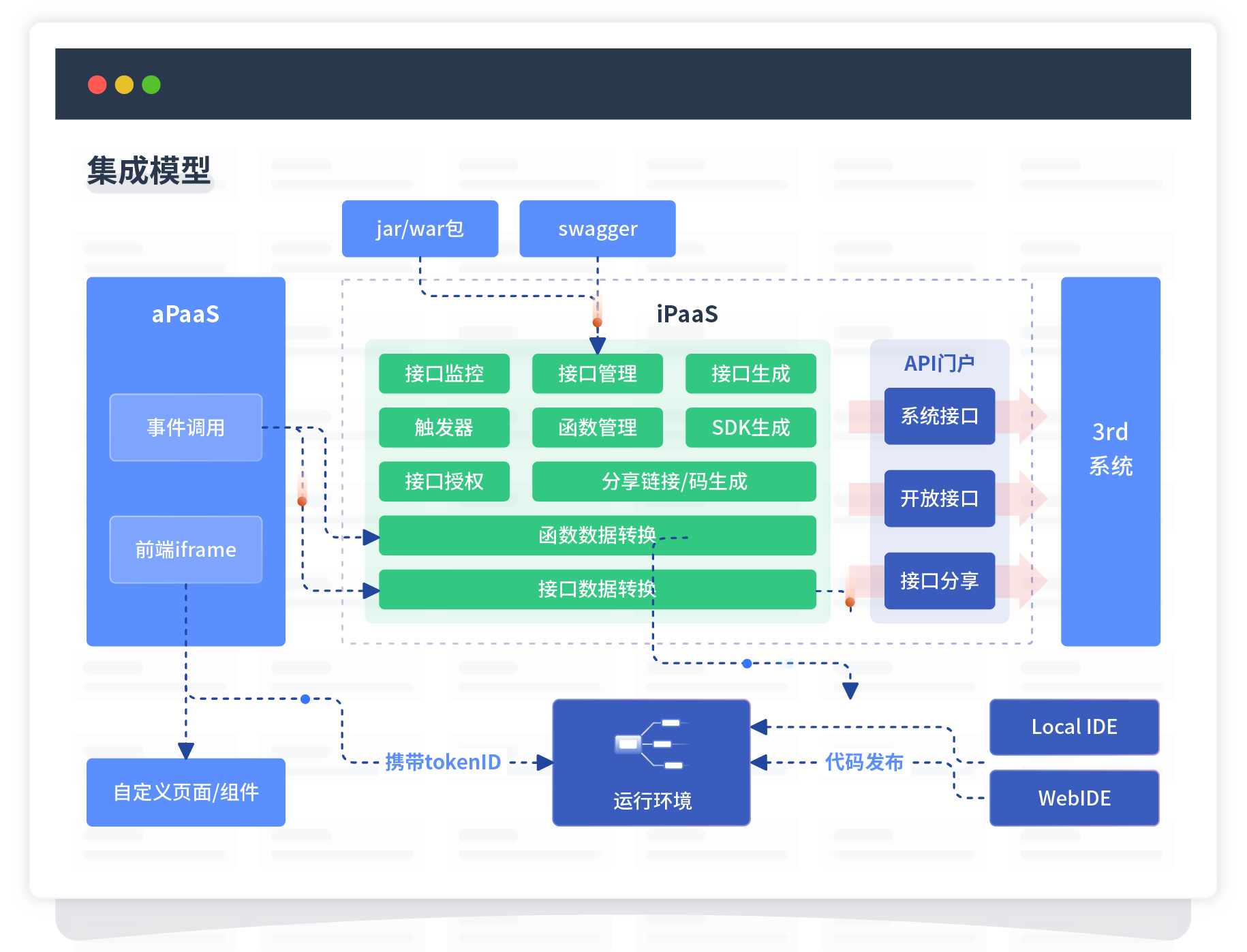 集成模型包括平台本身前、、、、、、、、、后端能力的扩展,,,,,,也支持通过API门户和第三方系统进行交互。。。。。。。